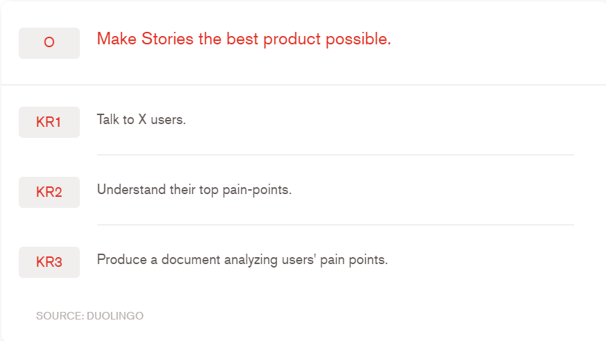 When Conor Walsh joined Duolingo, the Duolingo Stories feature had been declining for months. Resources were tight and management was sceptical. Rather than starting with an Objective like "increase Stories traffic by 50%," Walsh set an OKR centred on deeply understanding their Stories users.