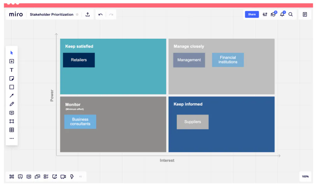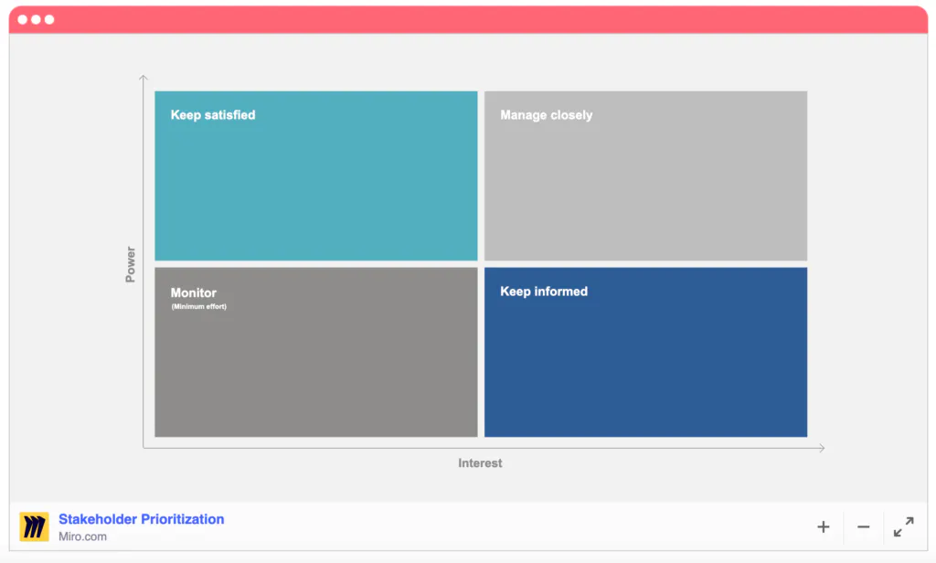 - Stakeholder Prioritisation — organise stakeholders into 4 groups by power and interest: